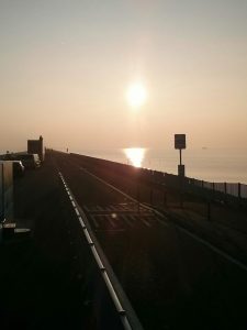 Bei der Überfahrt des Ijsselmeer-Damms natürlich bei besten Wetter (leider war es doch etwas trüb, die Fernsicht sehr eingeschränkt) natürlich am „Afsluitdijk“ gehalten, rechts und links aufs Wasser geguckt. War ganz nett, die Sonne stand schon tief, die Aussicht halt begrenzt.